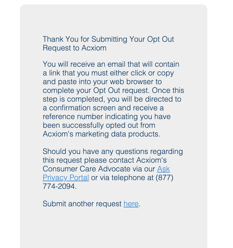 Step 3: Wait for a confirmation email from Acxiom verifying that your opt-out has been received. Once you get the email, click on the confirmation link.