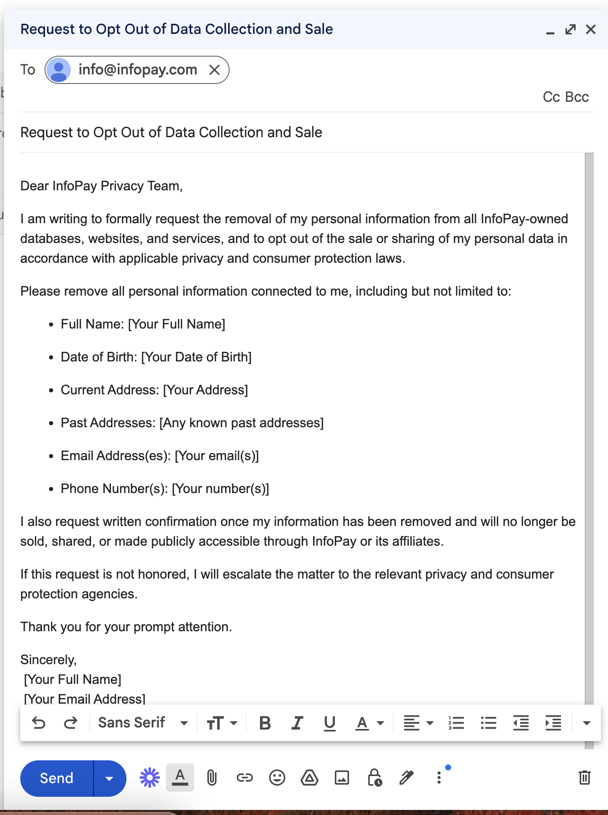 I am writing to formally request the removal of my personal information from all InfoPay-owned databases, websites, and services, and to opt out of the sale or sharing of my personal data in accordance with applicable privacy and consumer protection laws.