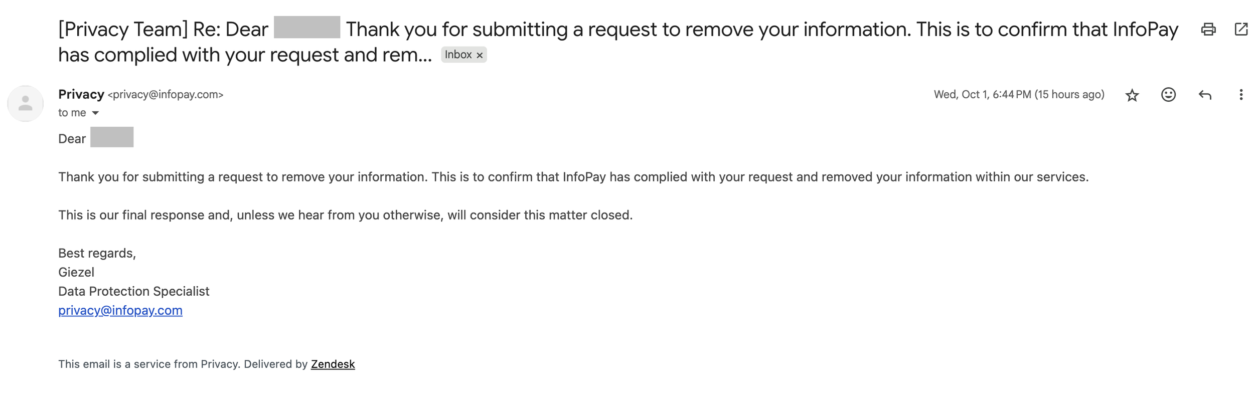 Step 4: Wait for confirmation. InfoPay typically responds within 7–10 business days, though removals may take longer to reflect across their network of sites. When the confirmation arrives, it’ll look like the below: