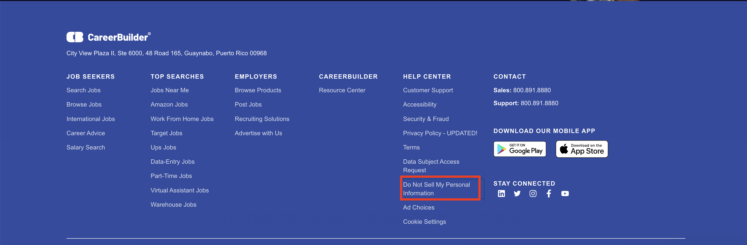Step 1: Go to the CareerBuilder Do Not Sell or Share My Information page. You can do this by heading to CareerBuilder.com and scrolling down to the website footer. Click the “Do Not Sell or Share My Information” link in the footer (highlighted in red below).