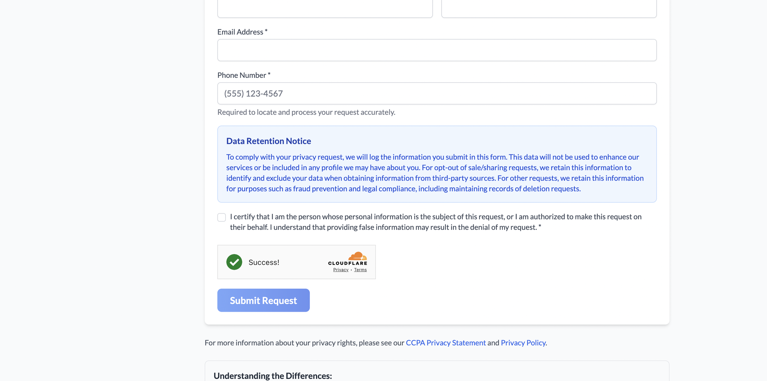 Step 1: Head over to the Lookify privacy rights request page (here). For “type of request”, select “opt out of sale/sharing”. Then, fill in the form with the rest of your information and click “submit”.