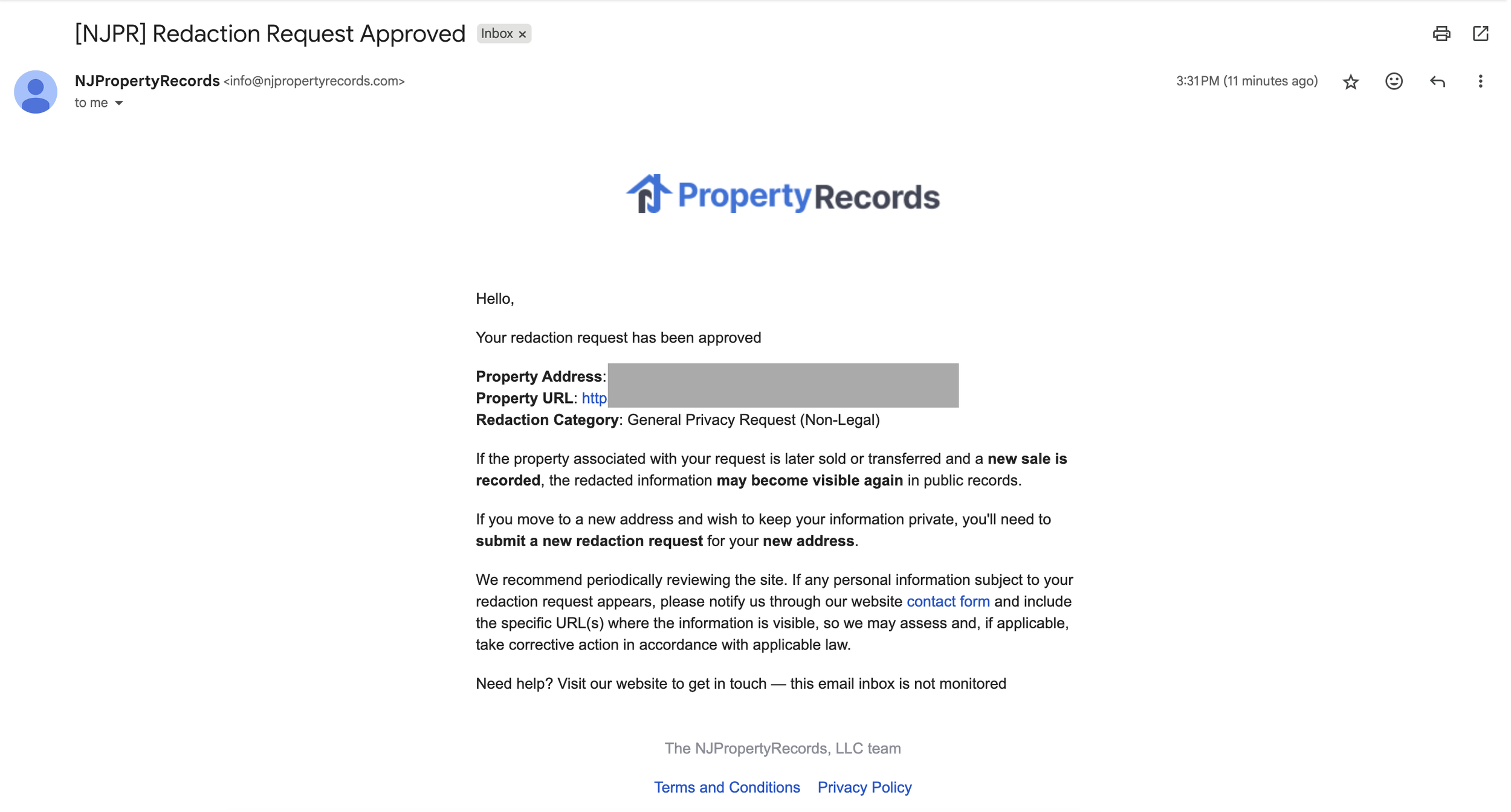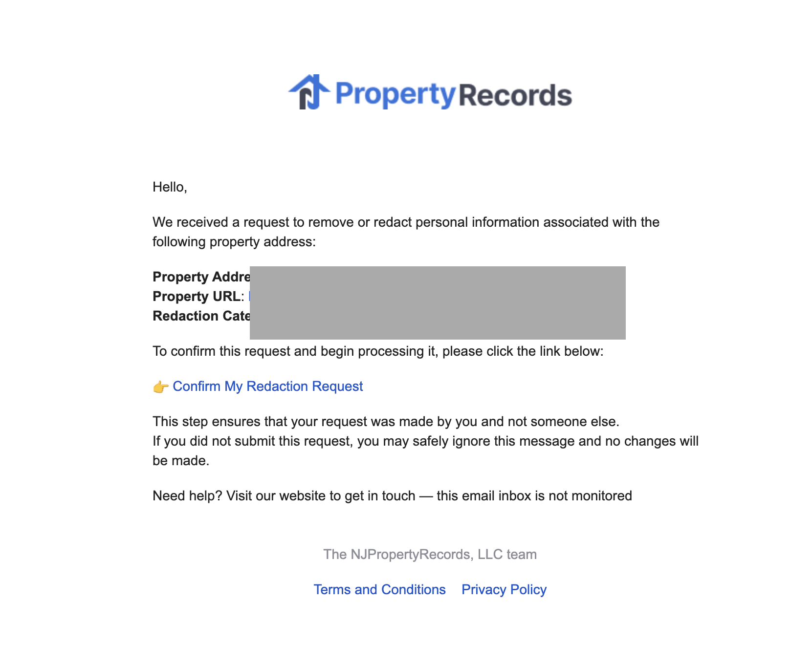 “I am requesting the redaction and removal of my personal information, including my name and property details, from NJPropertyRecords.com. Please confirm once this request has been completed.”