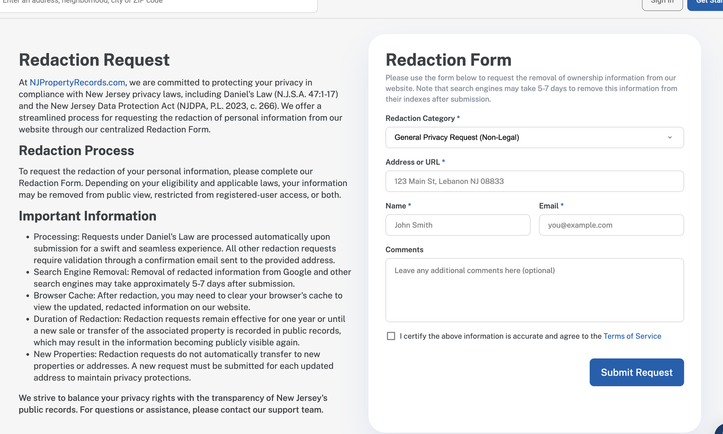 Keep in mind that NJ Property Records sources data from public county and state databases, so your property details may still appear on other government or third-party platforms. To minimize exposure, consider submitting removal requests to other property and people search sites as well.