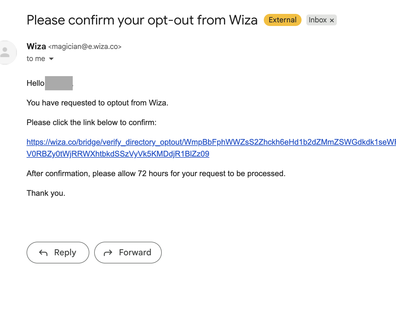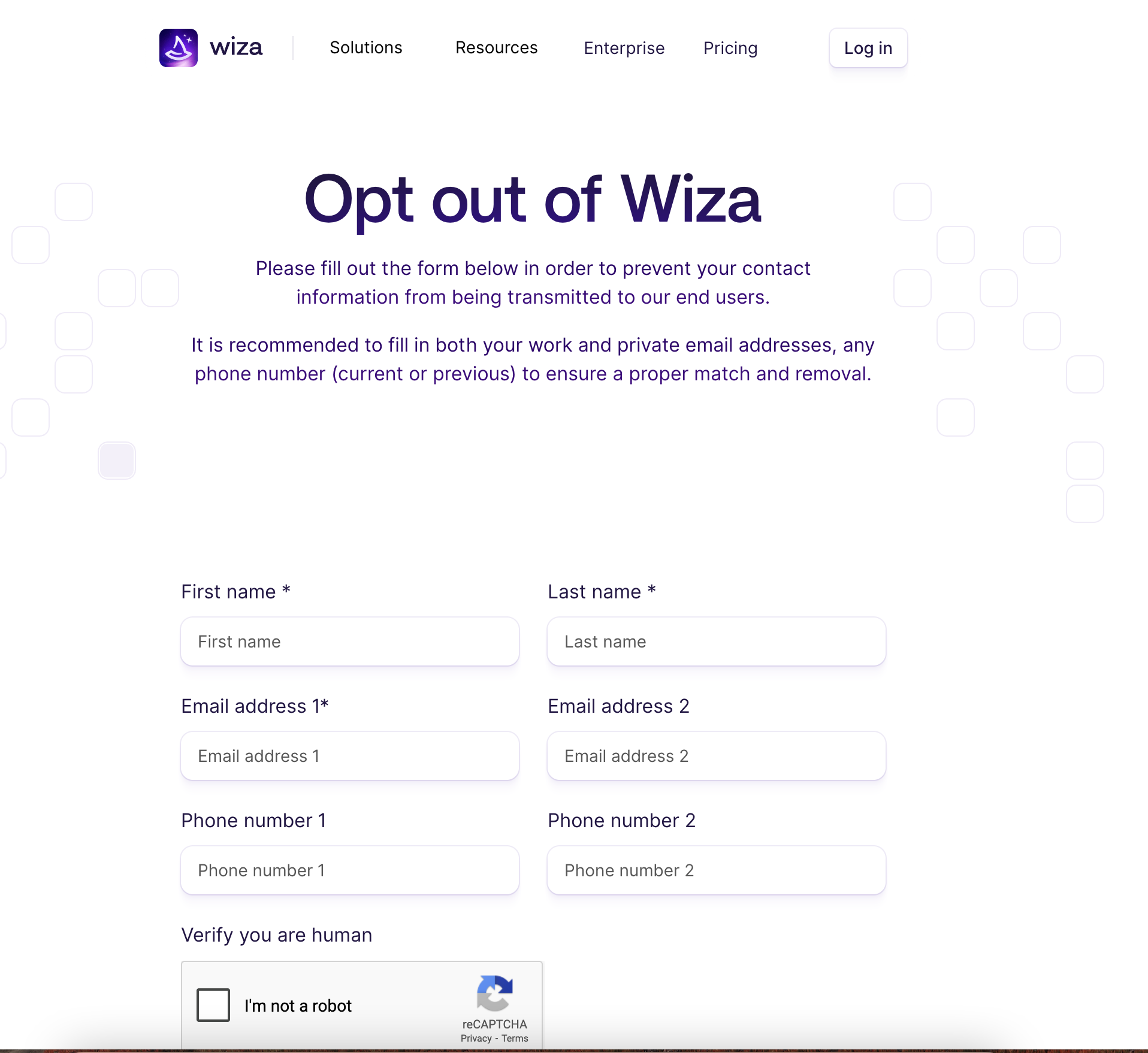 Wiza typically processes opt-out requests within 72 hours. You’ll receive confirmation once your information has been deleted or suppressed from their system. Because Wiza continuously gathers public data from external sources, it’s possible for your information to reappear if your contact details are reposted online.