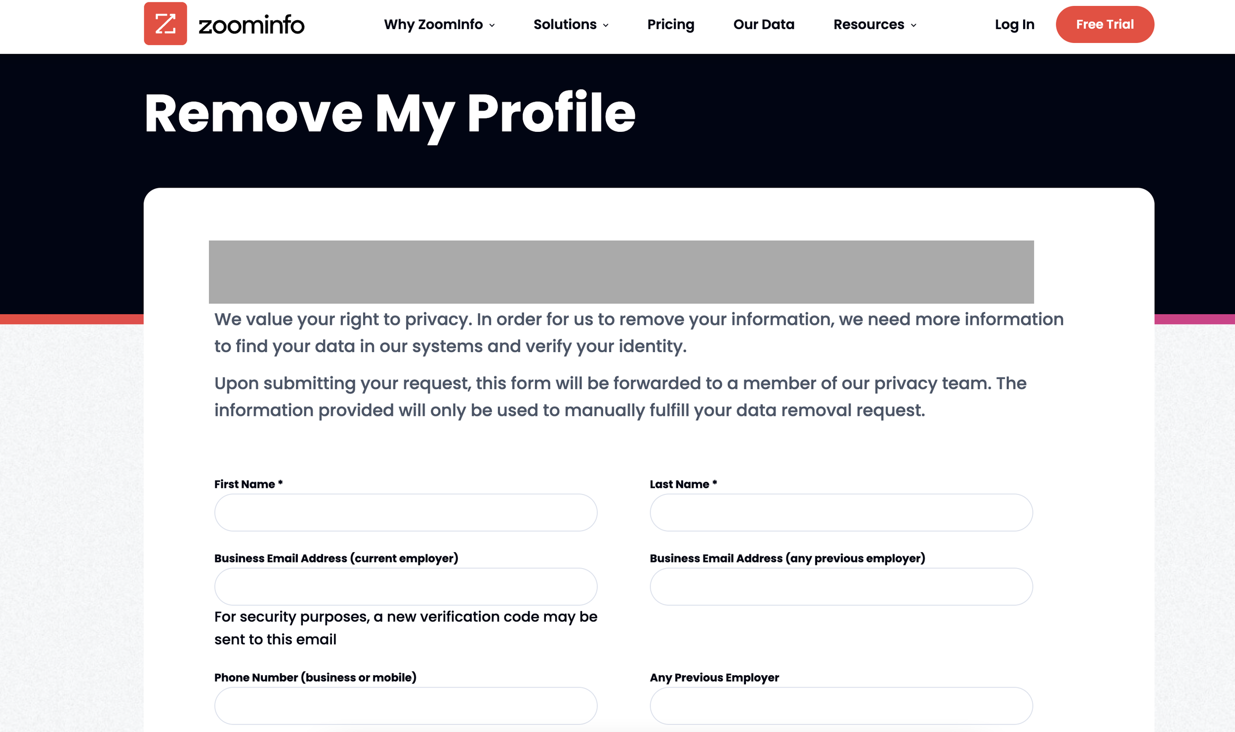 Step 1: Go to the ZoomInfo Privacy Portal. Visit https://www.zoominfo.com/trust-center/your-privacy. This is ZoomInfo’s official data privacy and rights center. Click the hyperlinked “request removal” link.