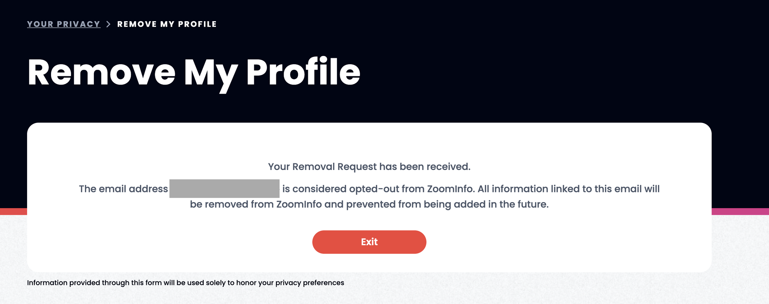 Step 4: Now you wait for confirmation. Once verified, ZoomInfo will process your request and send you an email confirming the suppression of your data.