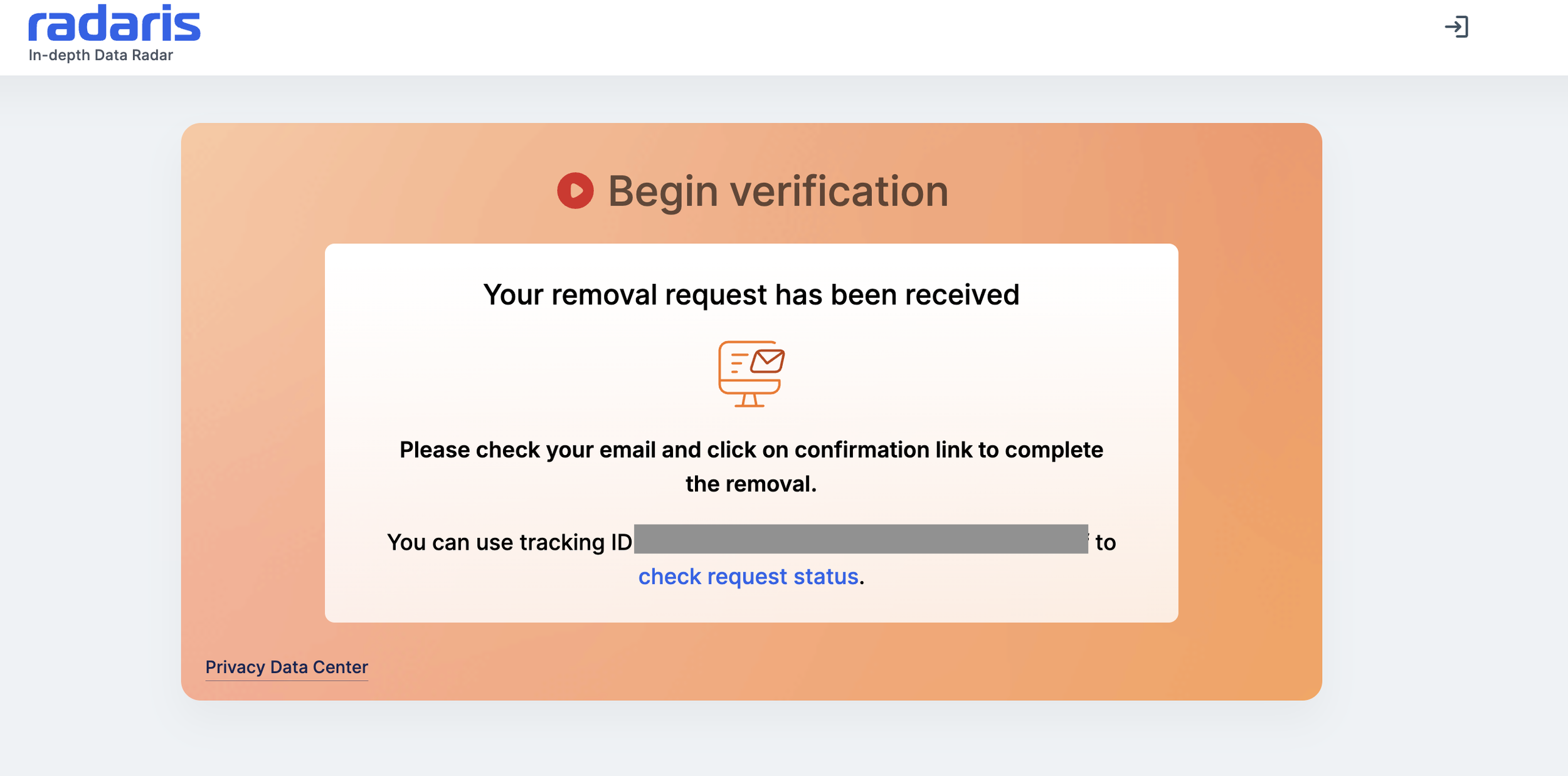 Step 8: Next, Radaris will attempt to verify your identity by sending you an email with a confirmation code. Click on the confirmation link within the email to complete the removal. Check the status of the removal using the tracking ID that they have provided. It can take a while to receive this email (it took 40 minutes for us).