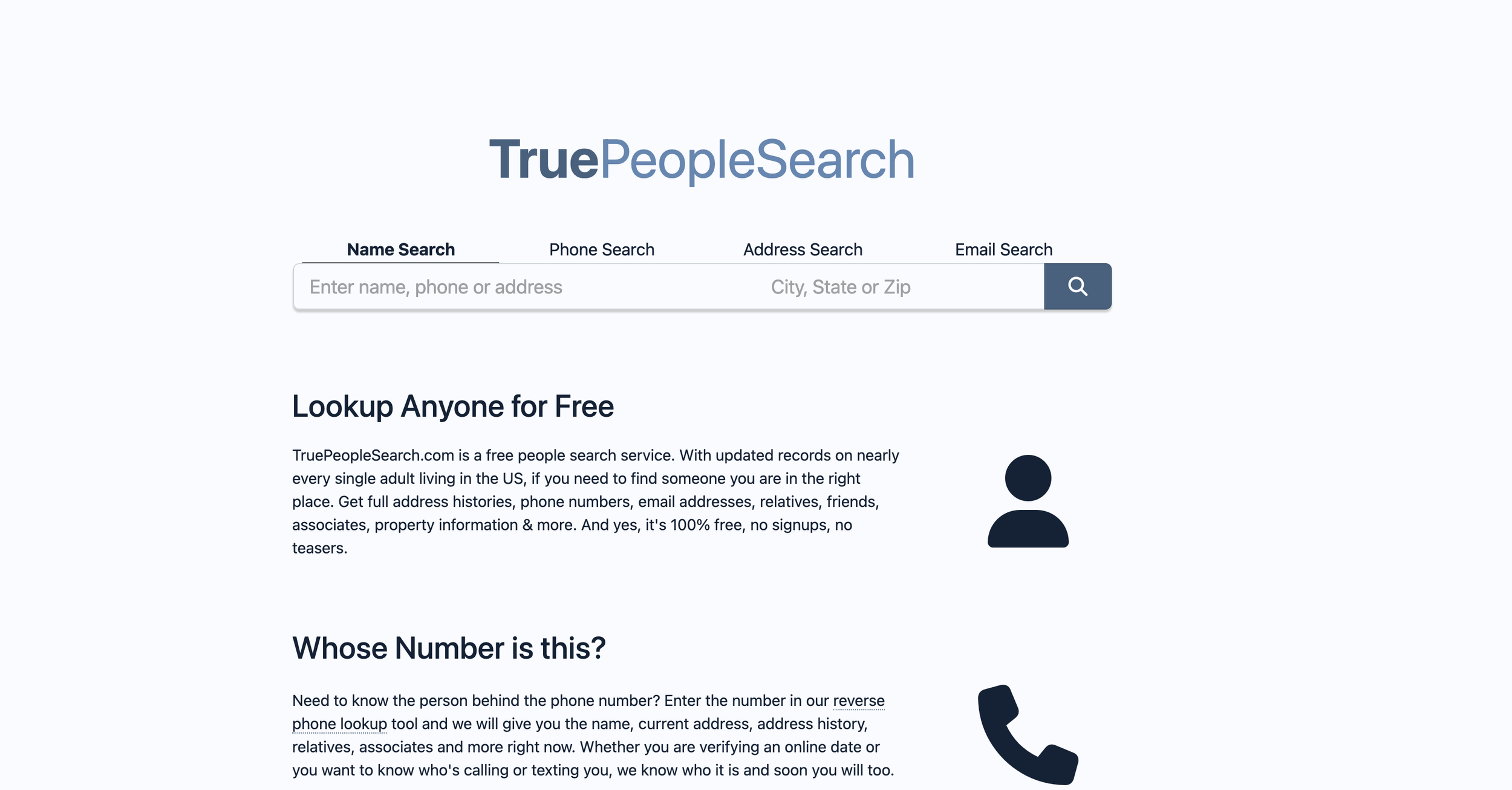 True People Search is a free people search engine and data broker that aggregates personal information from public records, marketing databases, and other online sources. The platform allows anyone to search by name, phone number, or address to find details such as contact information, previous addresses, known relatives, and sometimes property records.